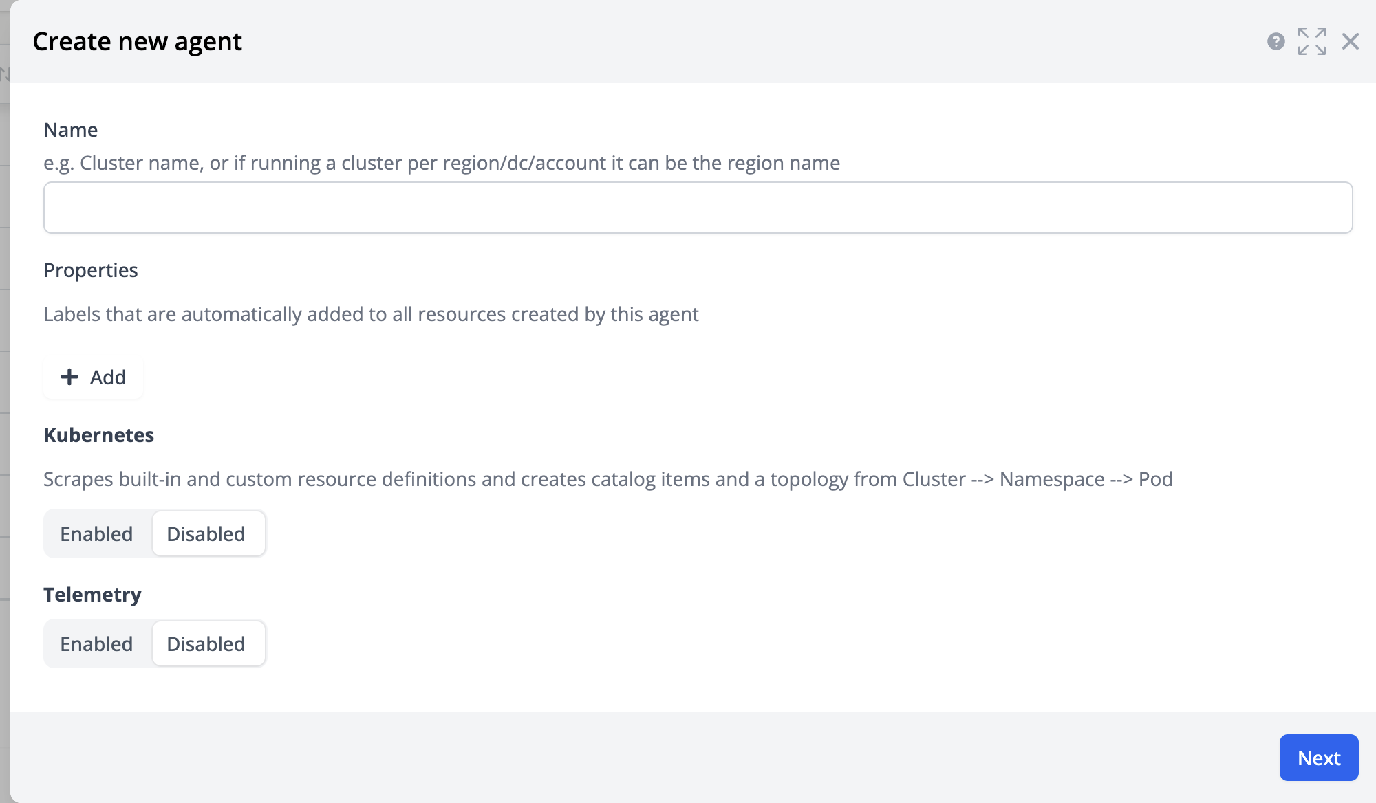 • Toggle Kubernetes to automatically scrape the cluster the agent is installed in, you can skip this step and perform it later by installing the chart