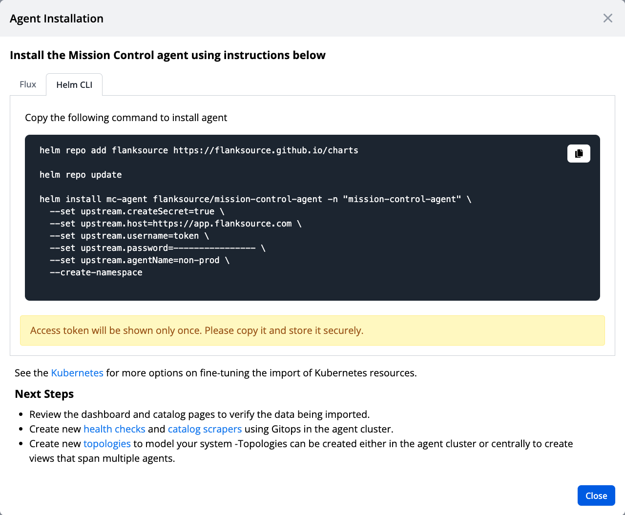 The recommended way of installing an agent is generating the Helm/Flux install script on the UI: