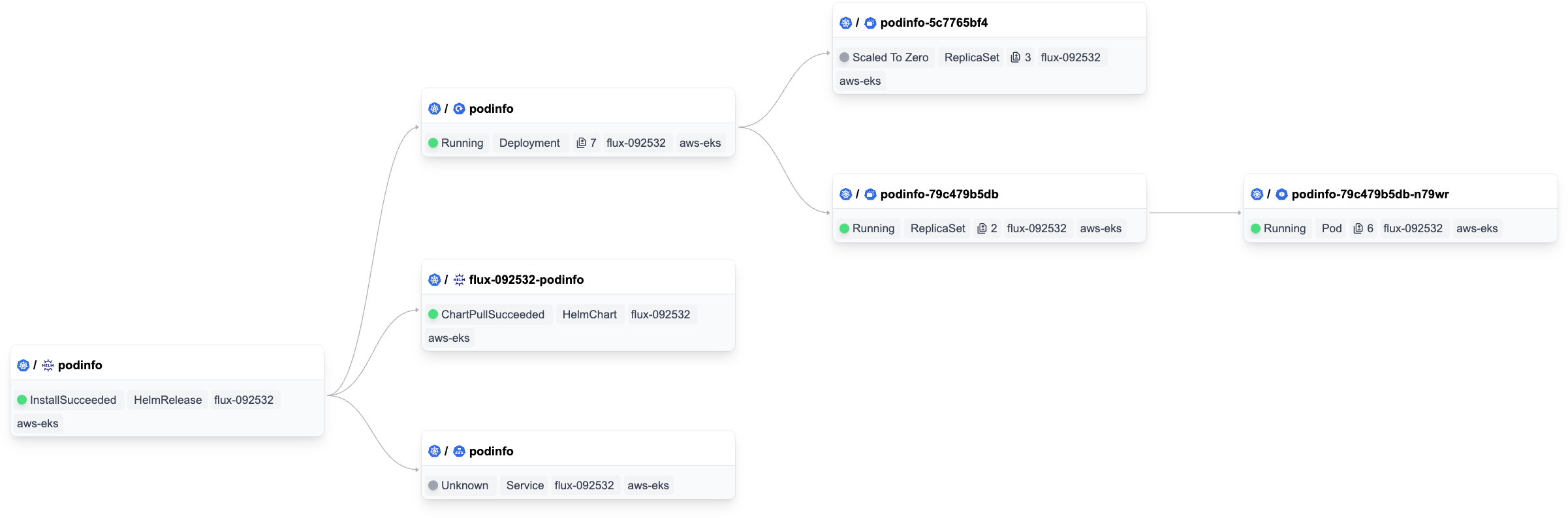 Mission Control provides built-in support for relating Flux resources to each other, determining their health status, and building a dependency graph. This allows you to: